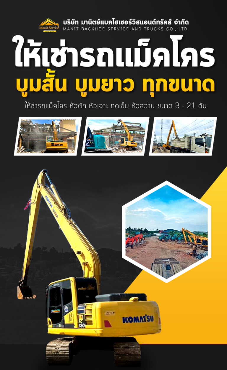 ให้เช่ารถแม็คโครบูมยาวกรุงเทพมหานคร รถแม็คโครรับจ้าง ราคาถูก — บริการครบวงจร พร้อมรายละเอียดงาน บริการรถแม็คโครบูมสั้น บ